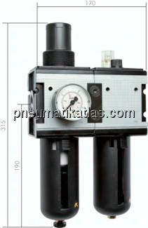 *Standardbaureihe, bitte bevorzugt einsetzen, da Druckregelbereich universell einsetzbar, **Tropfaufsatz aus Metall/Glas-Kombination, ***gemessen bei P1 = 10 bar, P2 = 6,3 bar und 1 bar Druckabfall, ****Sobald der Eingangsdruck unter den min. Eingangsdruck fällt, öffnet das Ablassventil automatisch. Durch Festdrehen der Ablassschraube kann die halbautomatische Ablassventilöffnung verhindert werden