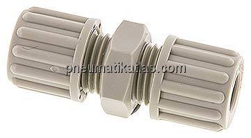 Der Schlauch wird über die feste Schlauchtülle in die Verschraubung geschoben und mit einem elastischen Klemmring durch Anziehen der Rändelmutter arretiert. Der elastische Klemmring ermöglicht es, innerhalb der gleichen Verschraubung mehrmals verwendet zu werden. Das bedeutet, die Verschraubung kann gelöst werden und mit dem gleichen Klemmring wieder dicht geschlossen werden. Alle Gewinde und Schlauchtüllen (für Schlauchaufnahme) sind nahtfrei.