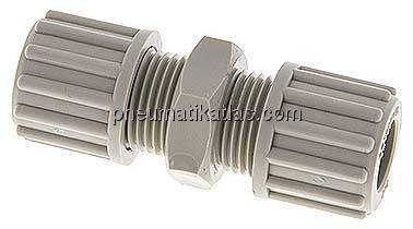Der Schlauch wird über die feste Schlauchtülle in die Verschraubung geschoben und mit einem elastischen Klemmring durch Anziehen der Rändelmutter arretiert. Der elastische Klemmring ermöglicht es, innerhalb der gleichen Verschraubung mehrmals verwendet zu werden. Das bedeutet, die Verschraubung kann gelöst werden und mit dem gleichen Klemmring wieder dicht geschlossen werden. Alle Gewinde und Schlauchtüllen (für Schlauchaufnahme) sind nahtfrei.