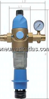 Kombinierte Station zur Druckregelung und Filtration (DVGW bauteilgeprüft) von Trink- und Betriebswasser sowie von chemiekalienfreiem Kühlwasser von Durchlaufkühlungen (kein Kreislaufwasser). Schützt die Rohrleitungen und die daran angeschlossenen Systemteile vor Funktionsstörungen und Korrosionsschäden durch im Wasser mitgeführte Fremdpartikel wie Rostteilchen, Späne, Sand, Hanf etc. Die Reinigung des Filterelements erfolgt durch manuelles Rückspülen (Ausspülen der Schmutzpartikel) in regelmäßigen Intervallen. Der ausgespülte Schmutz und das Spülwasser kann über einen Schlauch oder ein HT-Rohr abgeleitet werden.