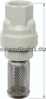 Gehäuse und Kegel: Polypropylen (glasfaserverstärkt), Feder: 1.4401, Dichtung: EPDM, Saugkorb: Gewindeteil und Sieb: 1.4401