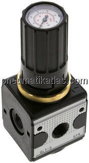 im Handrad integriertes Manometer, geeignet für den Einbau in Schalttafeln, Durch Verblockung mehrerer Regler können über eine Druckversorgung mehrere Druckluftkreise mit unabhängig regelbaren Drücken versorgt werden. Der Druckluftabgang ist an dem Manometeranschluss oder an dem gegenüber angeordneten G 1/4" Innengewinde (verschlossen).