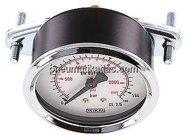 Gehäuse: Stahl schwarz, Frontring: Stahl verchromt, Messsystem: Cu-Legierung, (Drücke >= 100 bar: 1.4404), Anschluss: Messing, Sichtscheibe: Kunststoff glasklar, Befestigungsbügel: Stahl verzinkt, rückseitig