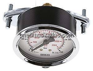 Gehäuse: Stahl schwarz, Frontring: Stahl verchromt, Messsystem: Cu-Legierung, (Drücke >= 100 bar: 1.4404), Anschluss: Messing, Sichtscheibe: Kunststoff glasklar, Befestigungsbügel: Stahl verzinkt, rückseitig