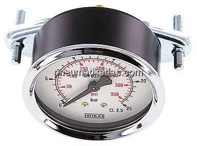 Gehäuse: Stahl schwarz, Frontring: Stahl verchromt, Messsystem: Cu-Legierung, (Drücke >= 100 bar: 1.4404), Anschluss: Messing, Sichtscheibe: Kunststoff glasklar, Befestigungsbügel: Stahl verzinkt, rückseitig