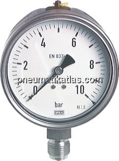 Startseite » Druckregler - Manometer - Thermometer - Aufbereiten » Manometer, senkrecht (auch für Vakuum) » Manometer senkrecht Ø 100 mm, Edelstahl - Chemie, Klasse 1,0 » Chemie-Manometer senkrecht, 100mm, 0 - 100 bar
