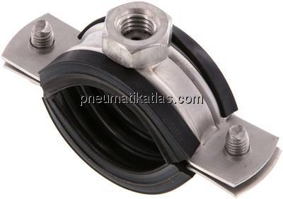 Typ mit Einlage: Schallschutz für DIN 4109, Rohrschelle wird vor der Rohrmontage seitlich aufgeklappt, daher leichtes Einlegen des Rohres, durch sicheres Einrasten kann das Rohr vormontiert und vor dem Festziehen der Schelle justiert werden