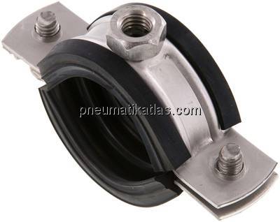 Typ mit Einlage: Schallschutz für DIN 4109, Rohrschelle wird vor der Rohrmontage seitlich aufgeklappt, daher leichtes Einlegen des Rohres, durch sicheres Einrasten kann das Rohr vormontiert und vor dem Festziehen der Schelle justiert werden