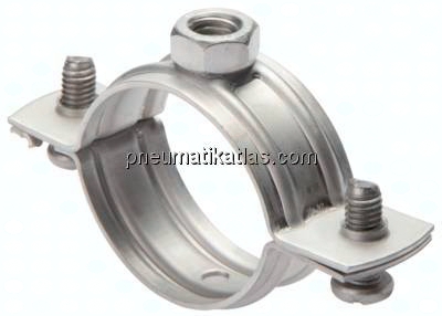 Typ mit Einlage: Schallschutz für DIN 4109, Rohrschelle wird vor der Rohrmontage seitlich aufgeklappt, daher leichtes Einlegen des Rohres, durch sicheres Einrasten kann das Rohr vormontiert und vor dem Festziehen der Schelle justiert werden